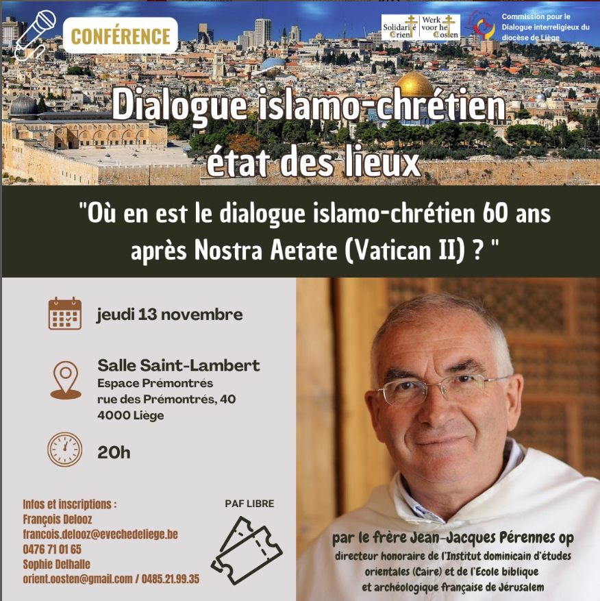 L’association Solidarité Orient (« petite sœur » belge de L’œuvre d’Orient) et la Commission pour le Dialogue interreligieux du Diocèse de Liège annoncent une conférence qui devrait être très intéressante pour les personnes qui s’intéressent aux relations entre les religions