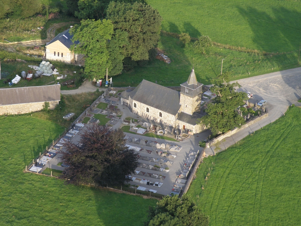 L’ensemble de l’édifice est entouré par le cimetière -agrandi pour la deuxième fois en 2011- où se dressent un gigantesque chêne ainsi que de très vieilles croix de schiste. Un mur d’enceinte assure à ce remarquable ensemble calme et sérénité.