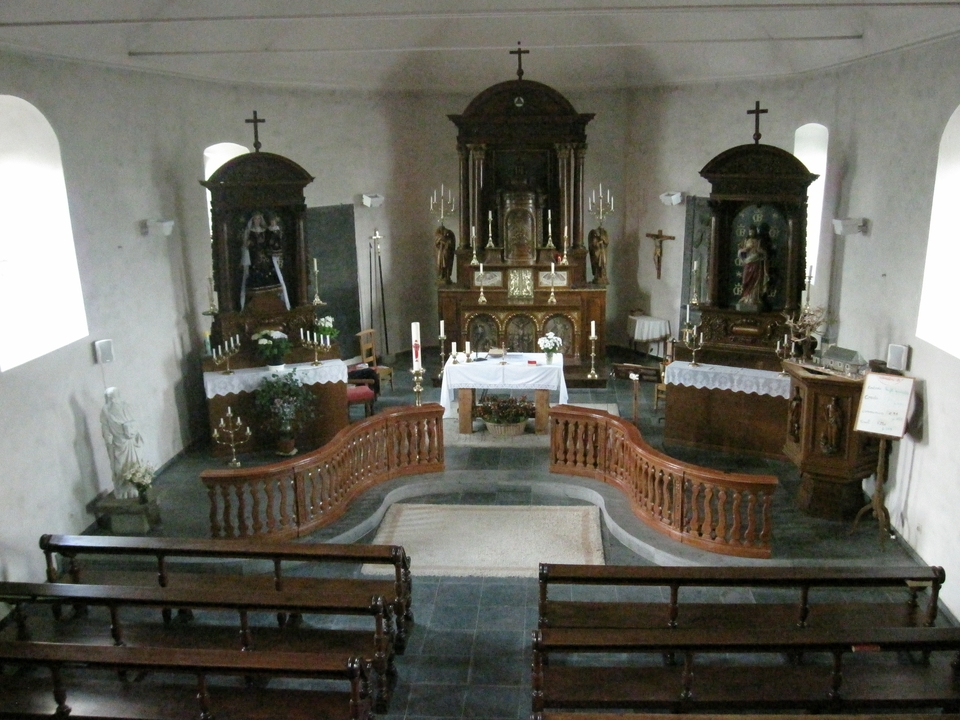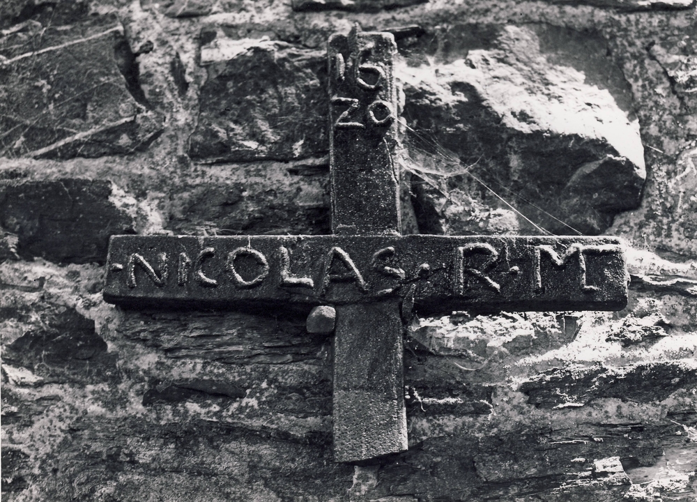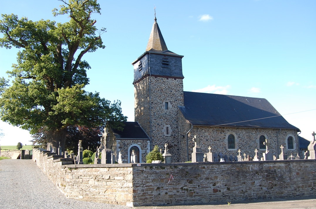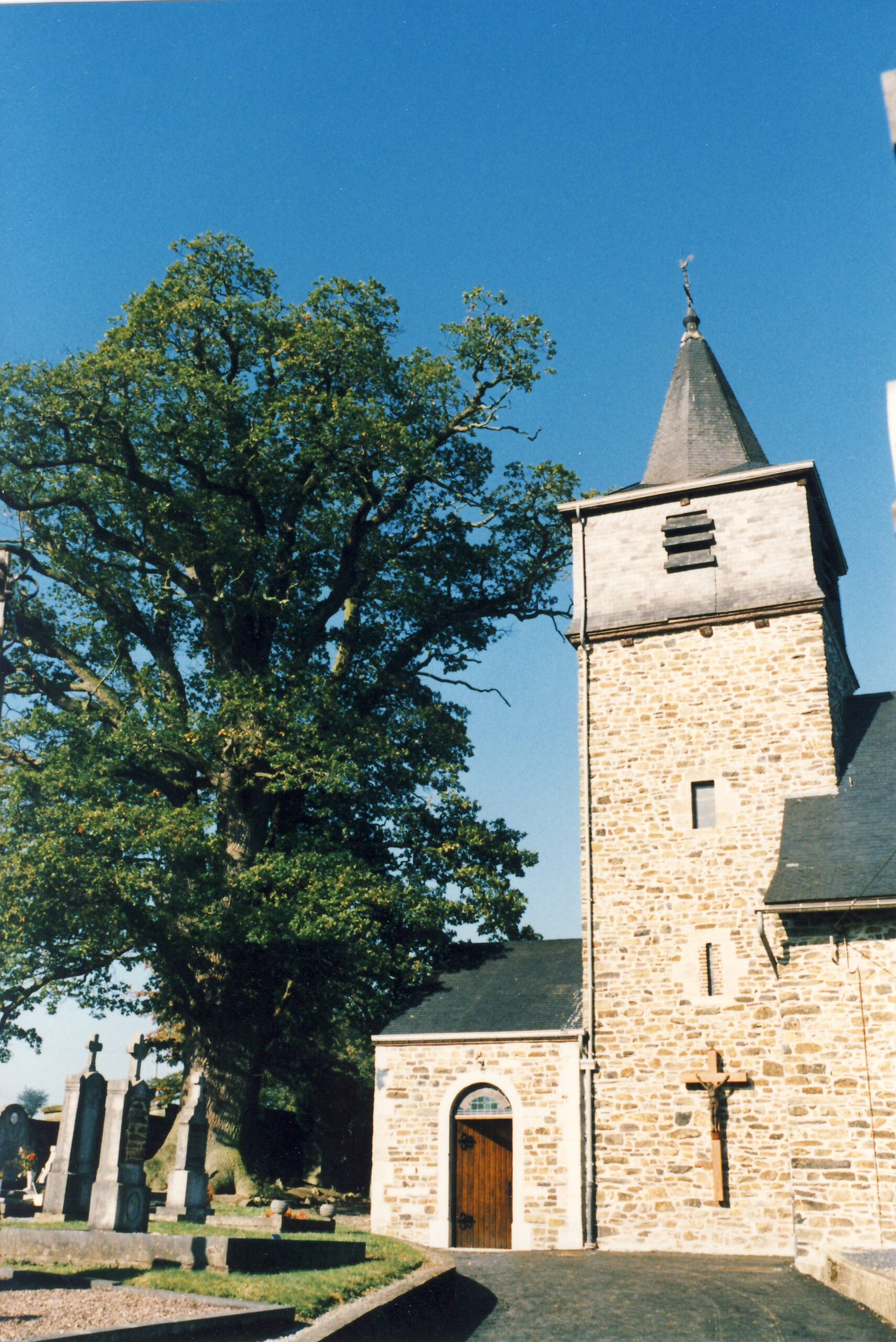 En face du chêne, sur le mur du parvis, un morceau de croix en fonte datant de 1620, au nom de Nicolas R.M. Les nombreuses croix de schiste adossées aux murs de l’église et du cimetière, dont la plus ancienne date de 1694 et dont l’une présente un motif unique au monde : une mère portant son enfant tout emmailloté, la défunte étant décédée lors de son accouchement; remarquez la chaînette avec croix qui pend à son cou (en sortant de l’église, première pierre à gauche).