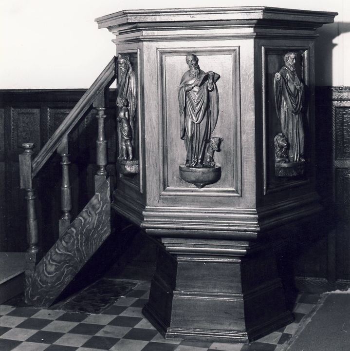 Sur quatre des panneaux de la chaire de vérité (bois peint, milieu du XIXème s.) on peut reconnaître, grâce à leurs attributs, les évangélistes.