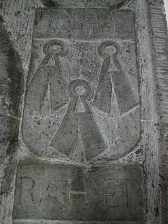 A gauche, celle (265×123) de Godefroid, baron de Rahier, décédé en 1714 et de son épouse Anne Marie Philippine dit Argenteau d’Esneux. Le dessus est occupé par le motif d’un catafalque surmonté des armoiries « augmentées » – parce qu’ils sont devenus barons – de la famille de Rahier et de la famille d’Argenteau et encadré de quartiers. Une inscription occupe la moitié inférieure de la pierre où mémoire est faite des « nobles et illustres seigneurs de Rahier »