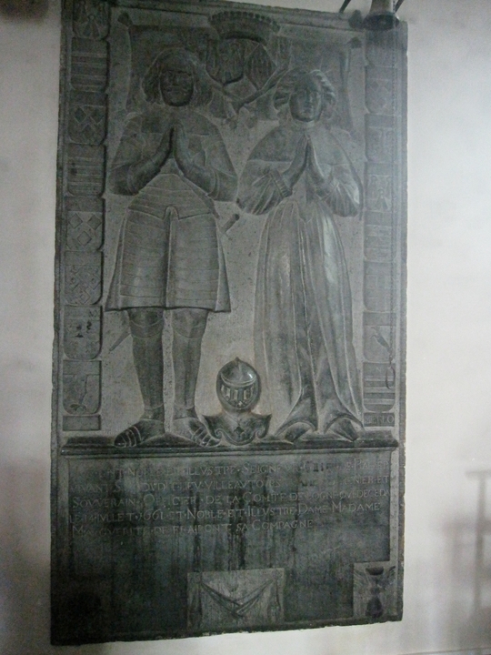 A droite, celle (265×150) de Gilles de Rahier (décédé en 1661) et de Marguerite de Fraipont, son épouse, avec l’effigie en pied des défunts encadrée de quartiers dont celui de Rahier. Entre les deux personnages, une armure symbolisant la protection. En dessous une inscription, un crâne et un sablier.