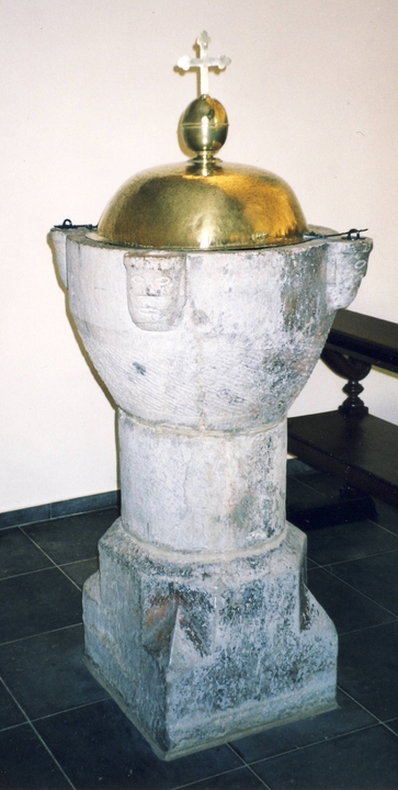 Les fonts baptismaux : ils se composent d’une cuve (pierre) à quatre têtes d’angle (XIIème s.) de style roman. Le fût et la base (pierre) dateraient du XVIème siècle. Le couvercle (XVIIème s.) et la croix (XIXème s.) qui le surmonte sont en laiton. C’est probablement la plus ancienne pièce de la chapelle primitive.