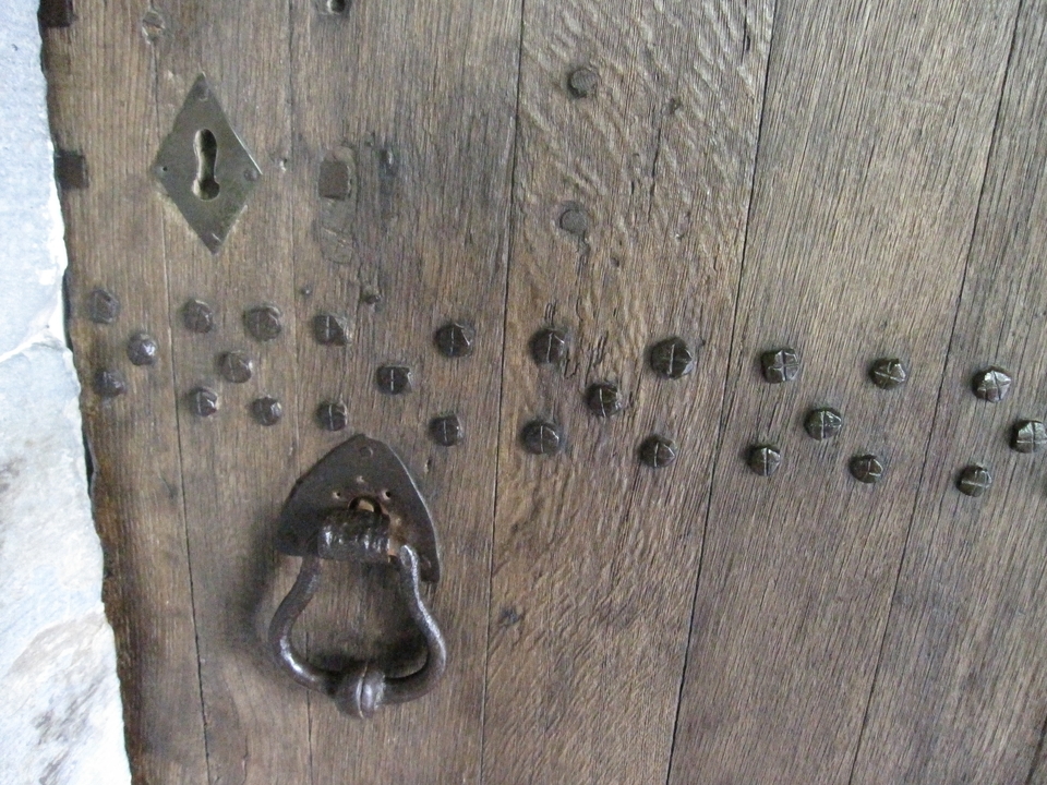 La porte d’entrée de l’église : très belle porte en chêne massif -qui pivote sans charnières- et garnie de clous en fer forgé. Elle était manifestement la porte extérieure de la chapelle primitive.