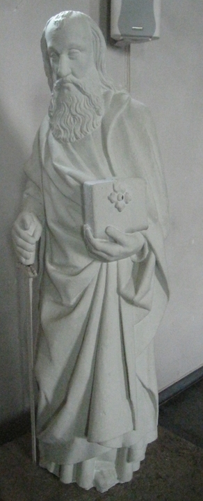 Parmi les statues en plâtre, celle de St-Paul – patron de l’église et de la paroisse – est en bois, mais recouverte (hélas !) de plâtre par souci d’uniformité (dans le choeur, à gauche).