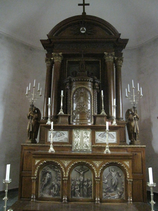 Au centre, les portes du tabernacle, en laiton, figurant des anges. De chaque côté de ces portes, un phylactère (banderole utilisée par l’artiste pour inscrire les paroles censées être prononcées par les anges représentés) porte l’inscription : Adoro te devote latens deitas, je t’adore avec respect, divinité cachée. Au sommet, un delta mystique avec l’œil de Dieu (symbole de la Trinité). Le devant de l’autel est orné de grisailles sur bois (1ère moitié du XXème s.) représentant Jésus au jardin des Oliviers, au Golgotha et la Résurrection. A l’arrière du maître-autel, tapissant l’intérieur d’une armoire, le faire-part de décès de la dernière baronne de Rahier, Marie Antoinette Henriette de Rahier, décédée à Liège, en 1816, à l’âge de 85 ans.